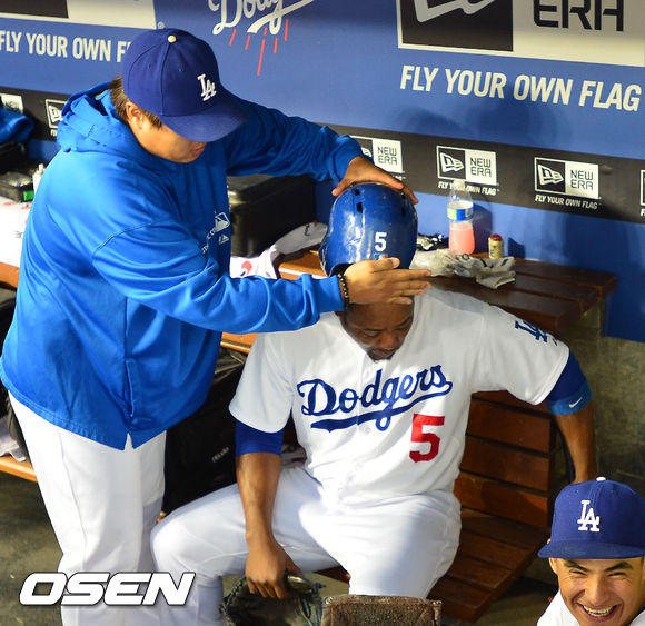 14일 (이하 한국시간) 미국 캘리포니아주 로스앤젤레스 다저스타디움에서 열린 2013 메이저리그 LA 다저스와 샌프란시스코 자이언츠의 경기, 덕아웃에서 다저스 류현진이 유리베에게 헬멧을 거꾸로 씌우고 있다.