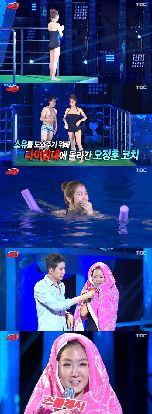 소유는 13일 오후 방송된 MBC 예능프로그램 '스타 다이빙쇼 스플래시'(이하 '스플래시')에서 공포증을 극복하고 다이빙대 위에 섰다.
