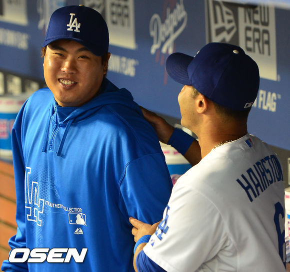 14일 (이하 한국시간) 미국 캘리포니아주 로스앤젤레스 다저스타디움에서 열린 2013 메이저리그 LA 다저스와 샌프란시스코 자이언츠의 경기, 덕아웃에서 다저스 류현진이 제리 헤어스톤 주니어와 포즈를 취한 후 함께 웃고 있다.