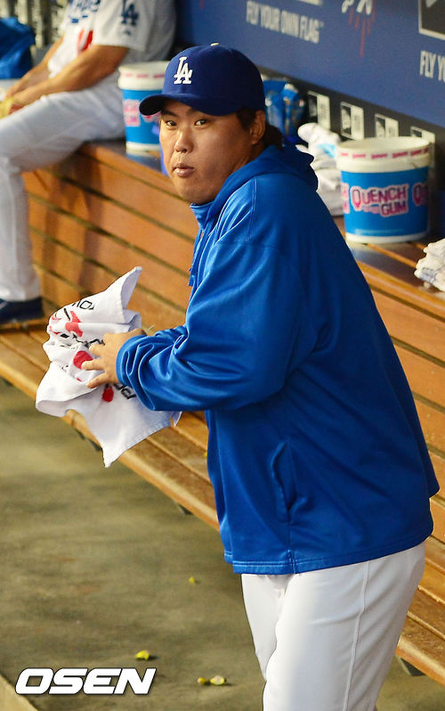 14일 (이하 한국시간) 미국 캘리포니아주 로스앤젤레스 다저스타디움에서 열린 2013 메이저리그 LA 다저스와 샌프란시스코 자이언츠의 경기, 덕아웃에서 다저스 류현진이 유리베에게 수건을 던지고 있다.