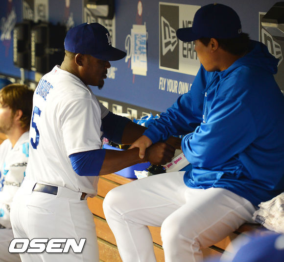 14일 (이하 한국시간) 미국 캘리포니아주 로스앤젤레스 다저스타디움에서 열린 2013 메이저리그 LA 다저스와 샌프란시스코 자이언츠의 경기, 덕아웃에서 다저스 류현진이 풍선껌 통해 손을 넣는 유리베의 팔을 잡고 있다.