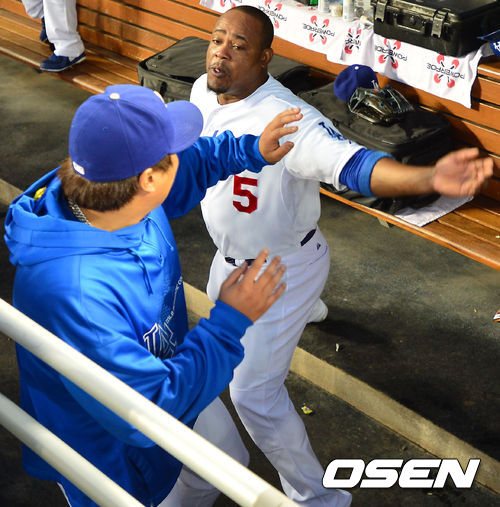 14일 (이하 한국시간) 미국 캘리포니아주 로스앤젤레스 다저스타디움에서 열린 2013 메이저리그 LA 다저스와 샌프란시스코 자이언츠의 경기, 덕아웃에서 다저스 유리베가 류현진을 장난으로 공격하고 있다.