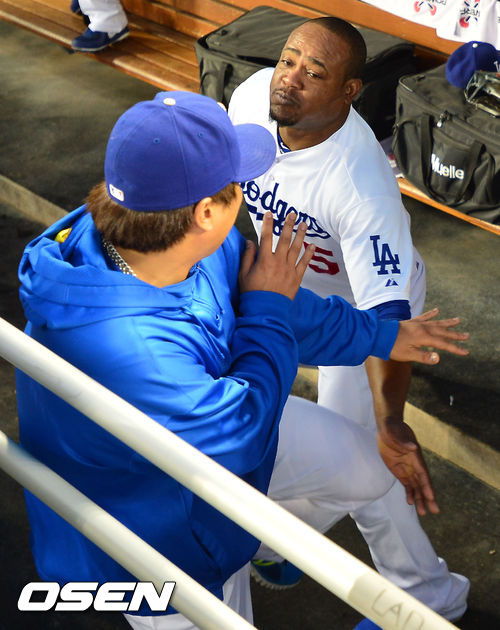 14일 (이하 한국시간) 미국 캘리포니아주 로스앤젤레스 다저스타디움에서 열린 2013 메이저리그 LA 다저스와 샌프란시스코 자이언츠의 경기, 덕아웃에서 다저스 유리베가 류현진을 장난으로 공격하고 있다.