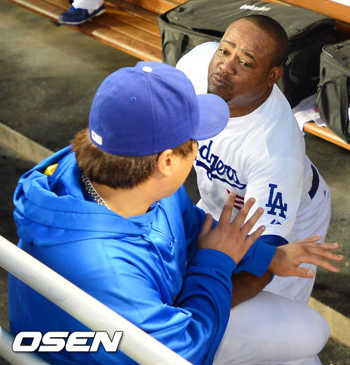 14일 (이하 한국시간) 미국 캘리포니아주 로스앤젤레스 다저스타디움에서 열린 2013 메이저리그 LA 다저스와 샌프란시스코 자이언츠의 경기, 덕아웃에서 다저스 유리베가 류현진을 장난으로 공격하고 있다.