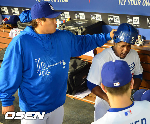 14일 (이하 한국시간) 미국 캘리포니아주 로스앤젤레스 다저스타디움에서 열린 2013 메이저리그 LA 다저스와 샌프란시스코 자이언츠의 경기, 덕아웃에서 다저스 류현진이 유리베에게 헬멧을 거꾸로 씌우고 있다.