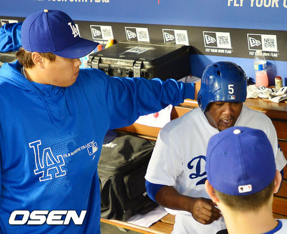 14일 (이하 한국시간) 미국 캘리포니아주 로스앤젤레스 다저스타디움에서 열린 2013 메이저리그 LA 다저스와 샌프란시스코 자이언츠의 경기, 덕아웃에서 다저스 류현진이 유리베에게 헬멧을 거꾸로 씌우고 있다.