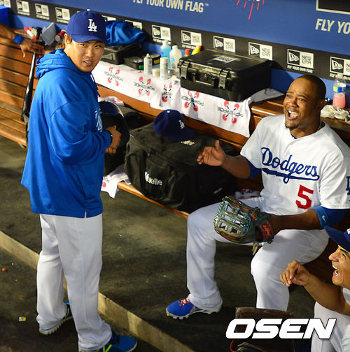 14일 (이하 한국시간) 미국 캘리포니아주 로스앤젤레스 다저스타디움에서 열린 2013 메이저리그 LA 다저스와 샌프란시스코 자이언츠의 경기, 덕아웃에서 다저스 류현진과 유리베가 환하게 웃고 있다.