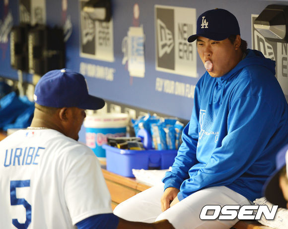 14일 (이하 한국시간) 미국 캘리포니아주 로스앤젤레스 다저스타디움에서 열린 2013 메이저리그 LA 다저스와 샌프란시스코 자이언츠의 경기, 덕아웃에서 다저스 류현진이 유리베가 다가오자 풍선껌을 불며 장난으로 위협하고 있다.