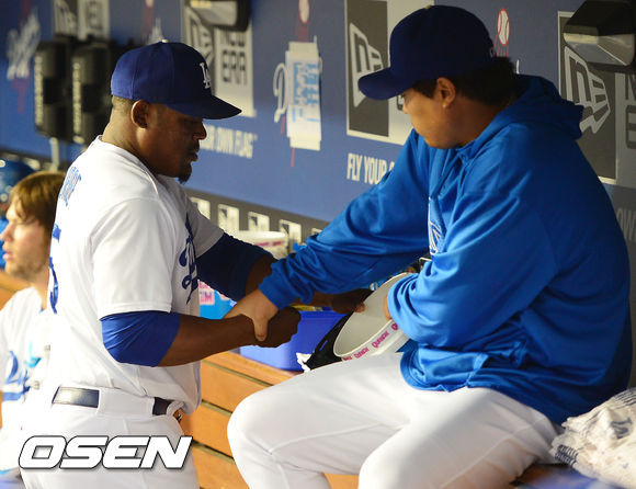 14일 (이하 한국시간) 미국 캘리포니아주 로스앤젤레스 다저스타디움에서 열린 2013 메이저리그 LA 다저스와 샌프란시스코 자이언츠의 경기, 덕아웃에서 다저스 유리베가 류현진의 등뒤에 감추고 있던 풍선껌 통에 손을 넣자 격렬히 저항하고 있다.
