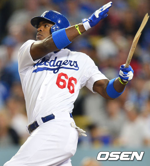 14일 (이하 한국시간) 미국 캘리포니아주 로스앤젤레스 다저스타디움에서 열린 2013 메이저리그 LA 다저스와 샌프란시스코 자이언츠의 경기, 3회말 선두타자 다저스 푸이그가 2루수 플라이 타구를 날리며 배트가 부러지고 있다.