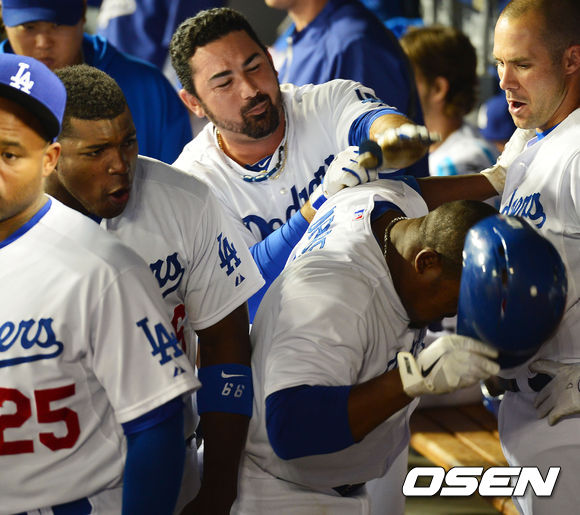 14일 (이하 한국시간) 미국 캘리포니아주 로스앤젤레스 다저스타디움에서 열린 2013 메이저리그 LA 다저스와 샌프란시스코 자이언츠의 경기, 6회말 1사 주자 1루 다저스 유리베가 좌중월 선취 투런 홈런을 날린 후 덕아웃에서 푸이그와 곤잘레스에게 맞고 있다.