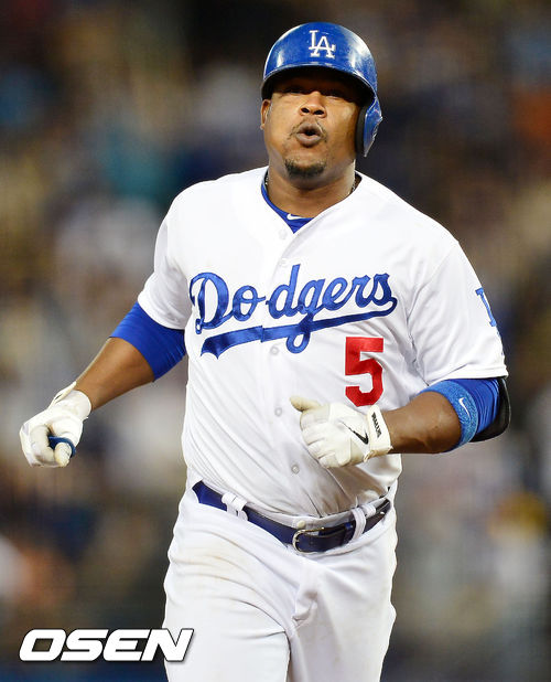 14일 (이하 한국시간) 미국 캘리포니아주 로스앤젤레스 다저스타디움에서 열린 2013 메이저리그 LA 다저스와 샌프란시스코 자이언츠의 경기, 6회말 1사 주자 1루 다저스 유리베가 좌중월 선취 투런 홈런을 날린 후 기뻐하며 그라운드를 돌고 있다.