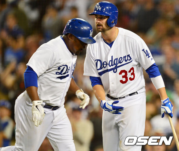 14일 (이하 한국시간) 미국 캘리포니아주 로스앤젤레스 다저스타디움에서 열린 2013 메이저리그 LA 다저스와 샌프란시스코 자이언츠의 경기, 6회말 1사 주자 1루 다저스 유리베가 좌중월 선취 투런 홈런을 날린 후 홈을 밟으며 반 슬라이크와 하이파이브를 하고 있다.
