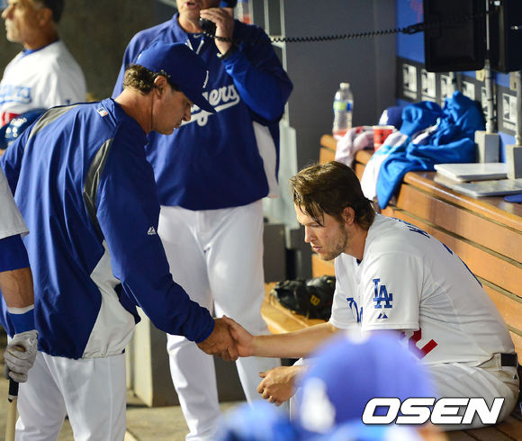 14일 (이하 한국시간) 미국 캘리포니아주 로스앤젤레스 다저스타디움에서 열린 2013 메이저리그 LA 다저스와 샌프란시스코 자이언츠의 경기, 7회초를 마친 다저스 선발 클레이튼 커쇼가 덕아웃에서 돈 매팅리 감독과 악수를 나누고 있다.