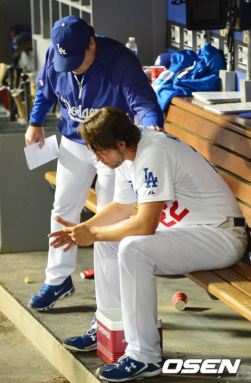 14일 (이하 한국시간) 미국 캘리포니아주 로스앤젤레스 다저스타디움에서 열린 2013 메이저리그 LA 다저스와 샌프란시스코 자이언츠의 경기, 7회초를 마친 다저스 선발 클레이튼 커쇼가 덕아웃에서 릭 허니컷 투수 코치가 격려를 받고 있다.