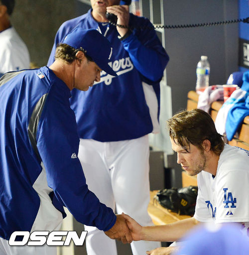 14일 (이하 한국시간) 미국 캘리포니아주 로스앤젤레스 다저스타디움에서 열린 2013 메이저리그 LA 다저스와 샌프란시스코 자이언츠의 경기, 7회초를 마친 다저스 선발 클레이튼 커쇼가 덕아웃에서 돈 매팅리 감독과 악수를 나누고 있다.
