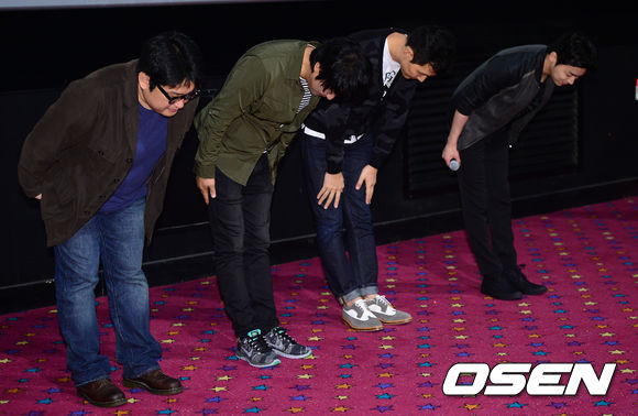 14일 오후 서울 용산 CGV에서 진행된 영화 '관상' 무대인사에서 한재림 감독, 송강호, 이정재, 조정석이 관객들에게 인사를 하고 있다.