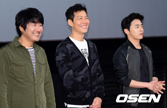 14일 오후 서울 용산 CGV에서 진행된 영화 '관상' 무대인사에서 송강호, 이정재, 조정석이 관객들에게 인사를 하고 있다.