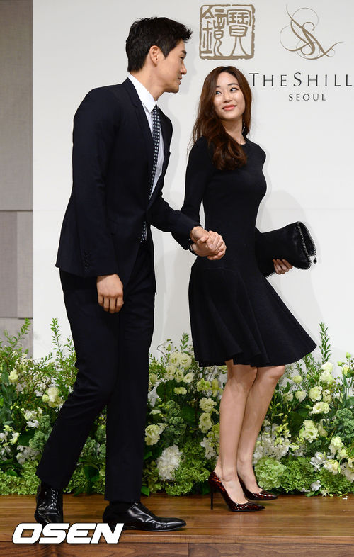 결혼식장을 찾은 유지태 김효진 부부가 포토월로 입장하고 있다.