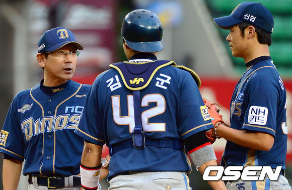 14일 오후 서울 잠실구장에서 열린 '2013 한국야쿠르트 세븐 프로야구' LG 트윈스와 NC 다이노스의 경기, 4회말 무사 만루 NC 최일언 코치가 마운드에 올라 이성민과 이야기를 나누고 있다.
