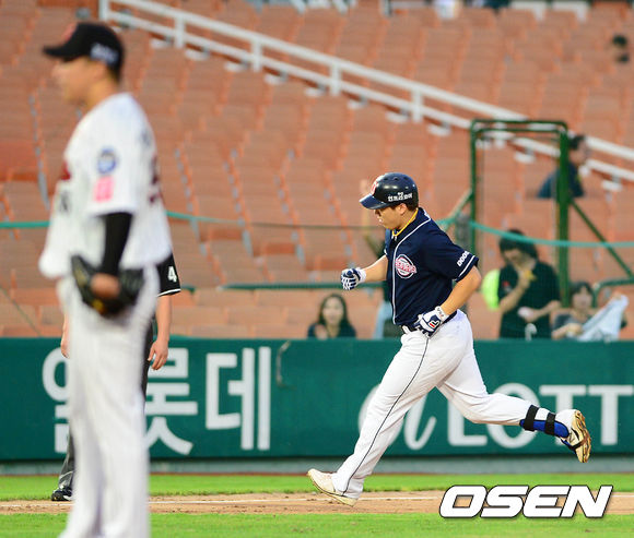 14일 오후 부산 사직야구장에서 열린 롯데 자이언츠와 두산 베어스의 경기, 5회초 1사 2루에서 두산 김현수가 우월 투런 홈런을 치고 그라운드를 돌고 있다.