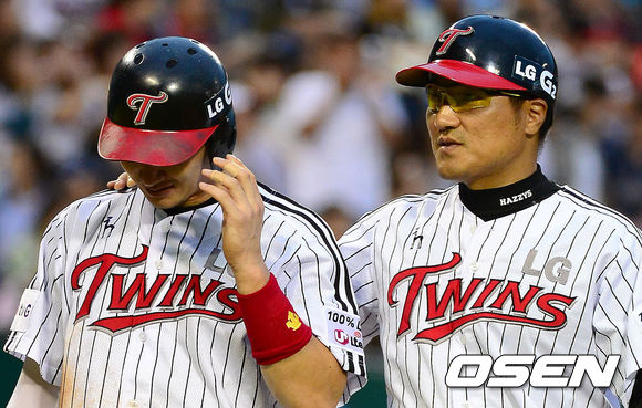 14일 오후 서울 잠실구장에서 열린 '2013 한국야쿠르트 세븐 프로야구' LG 트윈스와 NC 다이노스의 경기, LG 최태원 코치가 5회말 득점을 올리지 못하고 더그아웃으로 들어오는 손주인과 이야기를 나누고 있다.