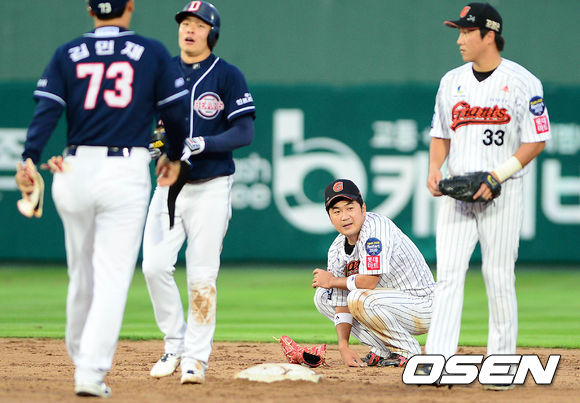 14일 오후 부산 사직야구장에서 열린 롯데 자이언츠와 두산 베어스의 경기, 5회초 1사에서 실책으로 두산 민병헌에게 내야안타를 허용한 롯데 문규현이 아쉬운 표정을 짓고 있다.