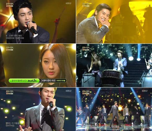 제국의 아이들은 14일 방송된 KBS 2TV '불후의 명곡, 전설을 노래하다'에 출연해 남진의 곡 '그대여 변치마오'를 열창했다. 이들은 걸그룹 나인뮤지스 경리의 지원사격 아래 뮤지컬의 한 장면을 연상시키는 드라마틱한 무대로 시선을 집중시켰다.