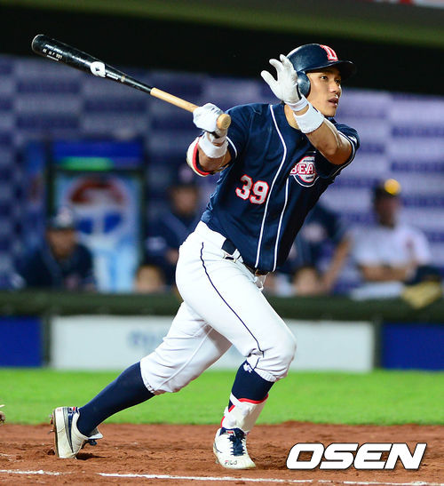 14일 오후 부산 사직야구장에서 열린 롯데 자이언츠와 두산 베어스의 경기, 6회초 1사 2,3루에서 두산 이종욱이 우전 2타점 적시타를 치고 있다.