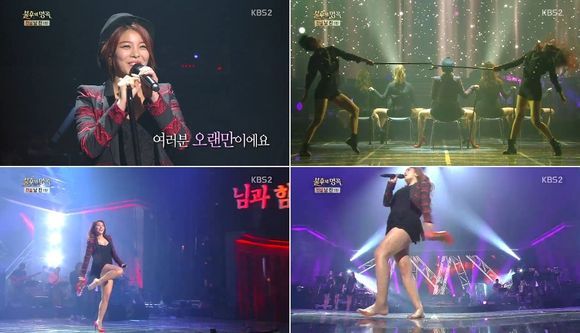 에일리는 14일 방송된 KBS 2TV '불후의 명곡, 전설을 노래하다'에서 남진의 곡 '빈 잔'을 부르며 섹시한 매력을 물씬 풍겼다. 다리를 벌리고 의자에 앉은 자세로 노래를 시작한 에일리는 마술사 모자와 지팡이를 소품으로 활용해 아찔한 무대를 이어갔다.