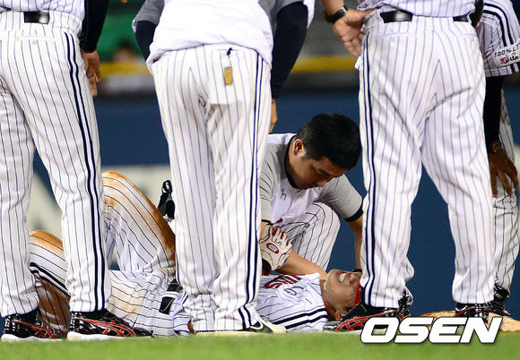 14일 오후 서울 잠실구장에서 열린 '2013 한국야쿠르트 세븐 프로야구' LG 트윈스와 NC 다이노스의 경기, 7회말 2사 2루 LG 김용의가 NC 이성민의 견제에 2루로 귀루하던중 그라운드에 누워 고통스러워 하고 있다.