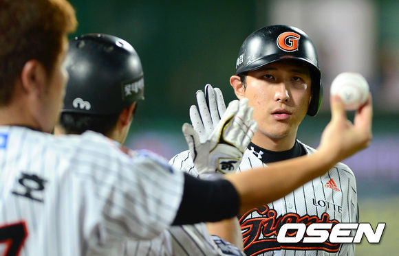 14일 오후 부산 사직야구장에서 열린 롯데 자이언츠와 두산 베어스의 경기, 6회말 2사 1,2루에서 롯데 황재균이 좌월 스리런 홈런을 치고 덕아웃에서 동료들의 축하를 받고 있다.