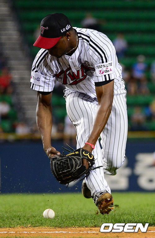 14일 오후 서울 잠실구장에서 열린 '2013 한국야쿠르트 세븐 프로야구' LG 트윈스와 NC 다이노스의 경기, 8회초 2사 LG 리즈가 NC 김종호의 투수앞 땅볼때 실책을 하고 있다.