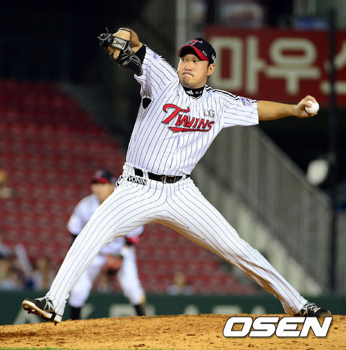 14일 오후 서울 잠실구장에서 열린 '2013 한국야쿠르트 세븐 프로야구' LG 트윈스와 NC 다이노스의 경기, 8회말 2사 1,2루 LG 봉중근이 마운드에 올라 역투하고 있다.