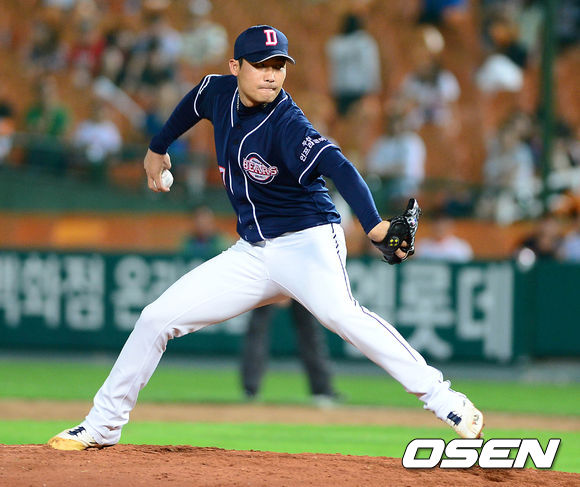 14일 오후 부산 사직야구장에서 열린 롯데 자이언츠와 두산 베어스의 경기, 9회말 두산 홍상삼이 힘차게 공을 던지고 있다.