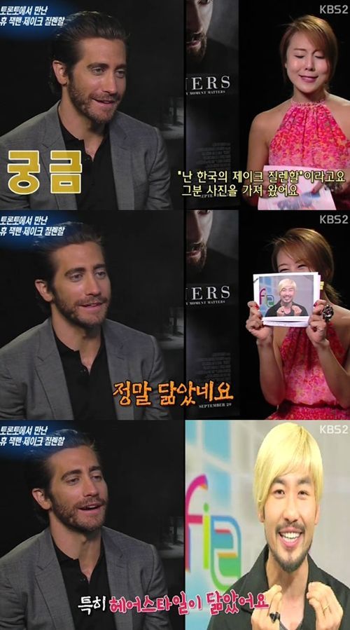 이어 제이크 질렌할은 최근 노홍철이 자신과 닮았다고 주장했다는 소식을 전해 듣고 "헤어스타일이 닮았다"라고 말해 웃음을 자아냈다.