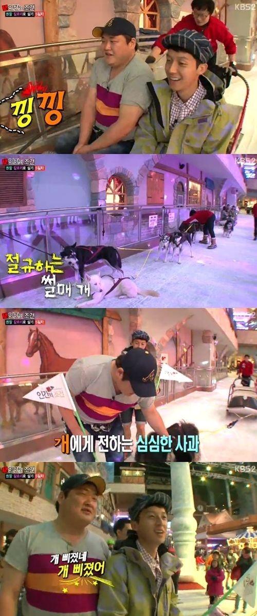 이에 김준현은 개썰매를 탄 뒤 개에게 "미안해"라고 사과했고, 허경환에는 "(무거우면) 얼마나 무겁다고 그래. 개 삐쳤네"고 말해 웃음을 자아냈다.
