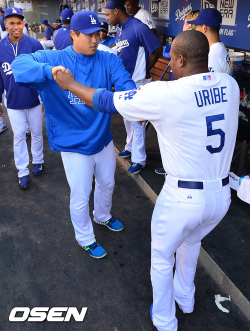 15일 (이하 한국시간) 미국 캘리포니아주 로스앤젤레스 다저스타디움에서 열린 2013 메이저리그 LA 다저스와 샌프란시스코 자이언츠의 경기,경기 전 다저스 덕아웃에서 유리베가 음악이 흐르자 류현진과 블루스를 추고 있다.