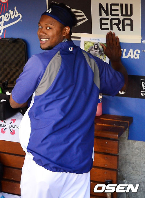 15일 (이하 한국시간) 미국 캘리포니아주 로스앤젤레스 다저스타디움에서 열린 2013 메이저리그 LA 다저스와 샌프란시스코 자이언츠의 경기,경기 전 다저스 덕아웃에서 라미레스가 유리베를 놀리기 위해 유리베 자리에 고릴라 포스터를 붙이고 있다.