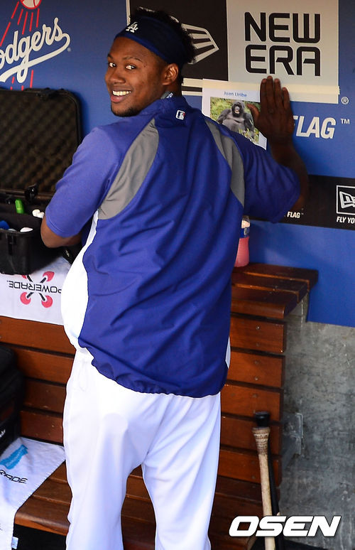 15일 (이하 한국시간) 미국 캘리포니아주 로스앤젤레스 다저스타디움에서 열린 2013 메이저리그 LA 다저스와 샌프란시스코 자이언츠의 경기,경기 전 다저스 덕아웃에서 라미레스가 유리베를 놀리기 위해 유리베 자리에 고릴라 포스터를 붙이고 있다.