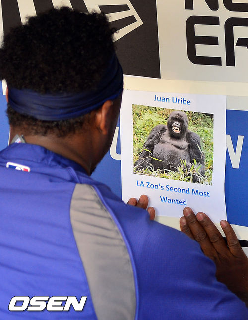 15일 (이하 한국시간) 미국 캘리포니아주 로스앤젤레스 다저스타디움에서 열린 2013 메이저리그 LA 다저스와 샌프란시스코 자이언츠의 경기,경기 전 다저스 덕아웃에서 라미레스가 유리베를 놀리기 위해 유리베 자리에 고릴라 포스터를 붙이고 있다.
