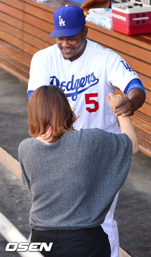 15일 (이하 한국시간) 미국 캘리포니아주 로스앤젤레스 다저스타디움에서 열린 2013 메이저리그 LA 다저스와 샌프란시스코 자이언츠의 경기,경기 전 다저스 덕아웃에서 유리베가 음악이 흐르자 취재 중인 한국 여기자와 갑자기 춤을 추고 있다.