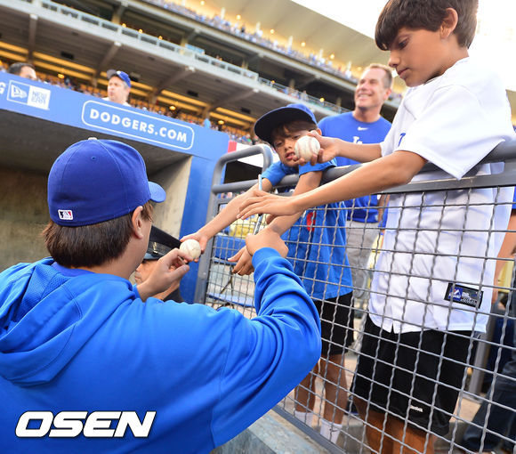 15일 (이하 한국시간) 미국 캘리포니아주 로스앤젤레스 다저스타디움에서 열린 2013 메이저리그 LA 다저스와 샌프란시스코 자이언츠의 경기,경기 전 다저스 덕아웃 류현진이 현지 아이들에게 사인을 해주고 있다.