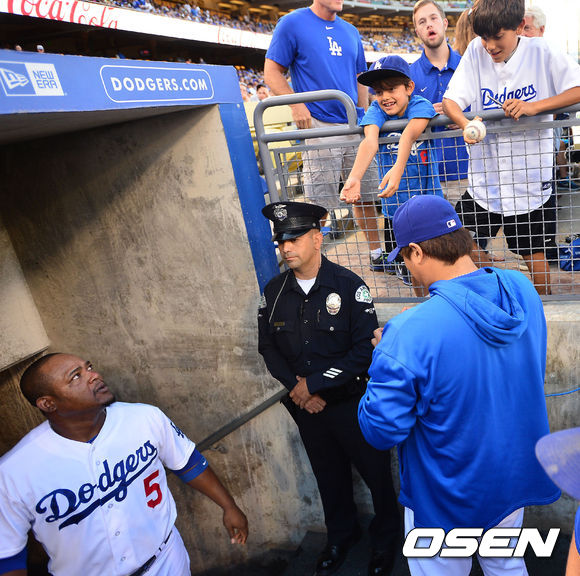15일 (이하 한국시간) 미국 캘리포니아주 로스앤젤레스 다저스타디움에서 열린 2013 메이저리그 LA 다저스와 샌프란시스코 자이언츠의 경기,경기 전 다저스 덕아웃에서 류현진이 팬에게 사인을 해주자 유리베가 이를 바라보고 있다.