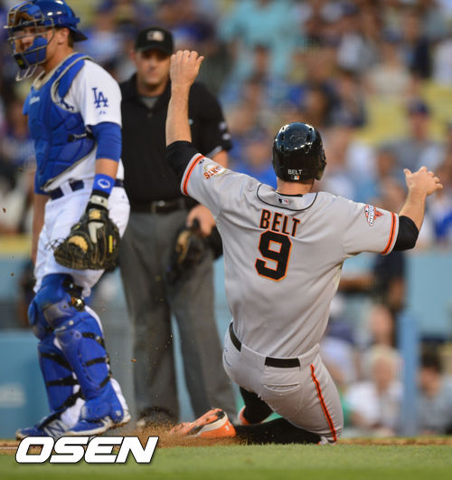 15일 (이하 한국시간) 미국 캘리포니아주 로스앤젤레스 다저스타디움에서 열린 2013 메이저리그 LA 다저스와 샌프란시스코 자이언츠의 경기,1회초 1사 주자 1,3루 샌프란시스코 펜스의 1타점 적시타때 벨트가 홈으로 몸을 던지고 있다.