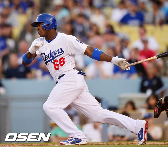 15일 (이하 한국시간) 미국 캘리포니아주 로스앤젤레스 다저스타디움에서 열린 2013 메이저리그 LA 다저스와 샌프란시스코 자이언츠의 경기,1회말 선두타자 다저스 푸이그가 중전 안타를 날리고 있다.