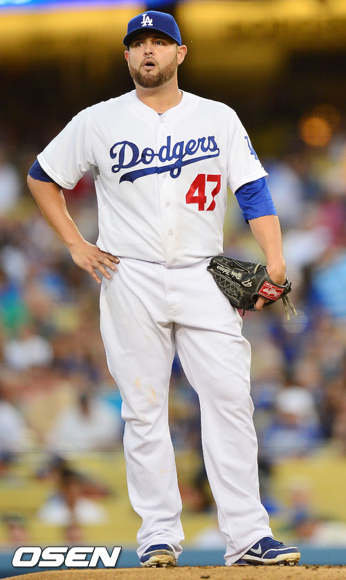 15일 (이하 한국시간) 미국 캘리포니아주 로스앤젤레스 다저스타디움에서 열린 2013 메이저리그 LA 다저스와 샌프란시스코 자이언츠의 경기,1회에 이어 2회에 대량 실점이 이어지자 다저스 선발 리키 놀라스코가 마운드 위에서 한 숨을 내쉬고 있다.