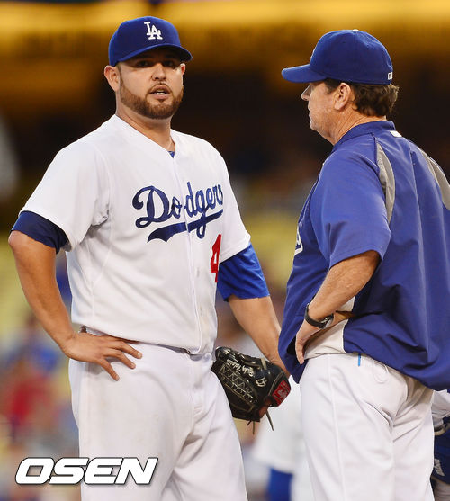 15일 (이하 한국시간) 미국 캘리포니아주 로스앤젤레스 다저스타디움에서 열린 2013 메이저리그 LA 다저스와 샌프란시스코 자이언츠의 경기,1회에 이어 2회에 대량 실점이 이어지자 다저스 선발 리키 놀라스코가 마운드 위에서 릭 허니컷 투수 코치와 얘기를 나누고 있다.