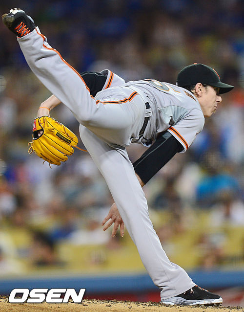 15일 (이하 한국시간) 미국 캘리포니아주 로스앤젤레스 다저스타디움에서 열린 2013 메이저리그 LA 다저스와 샌프란시스코 자이언츠의 경기, 샌프란시스코 선발 팀 린스컴이 힘차게 공을 뿌리고 있다.