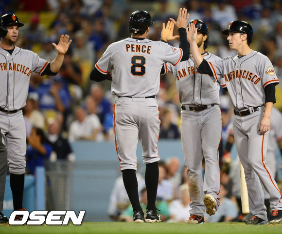 15일 (이하 한국시간) 미국 캘리포니아주 로스앤젤레스 다저스타디움에서 열린 2013 메이저리그 LA 다저스와 샌프란시스코 자이언츠의 경기, 5회초 2사 주자 만루 샌프란시스코 펜스가 만루 홈런을 날린 후 홈에서 선행주자였던 벨트, 파건, 린스컴과 함께 하이파이브를 하고 있다.